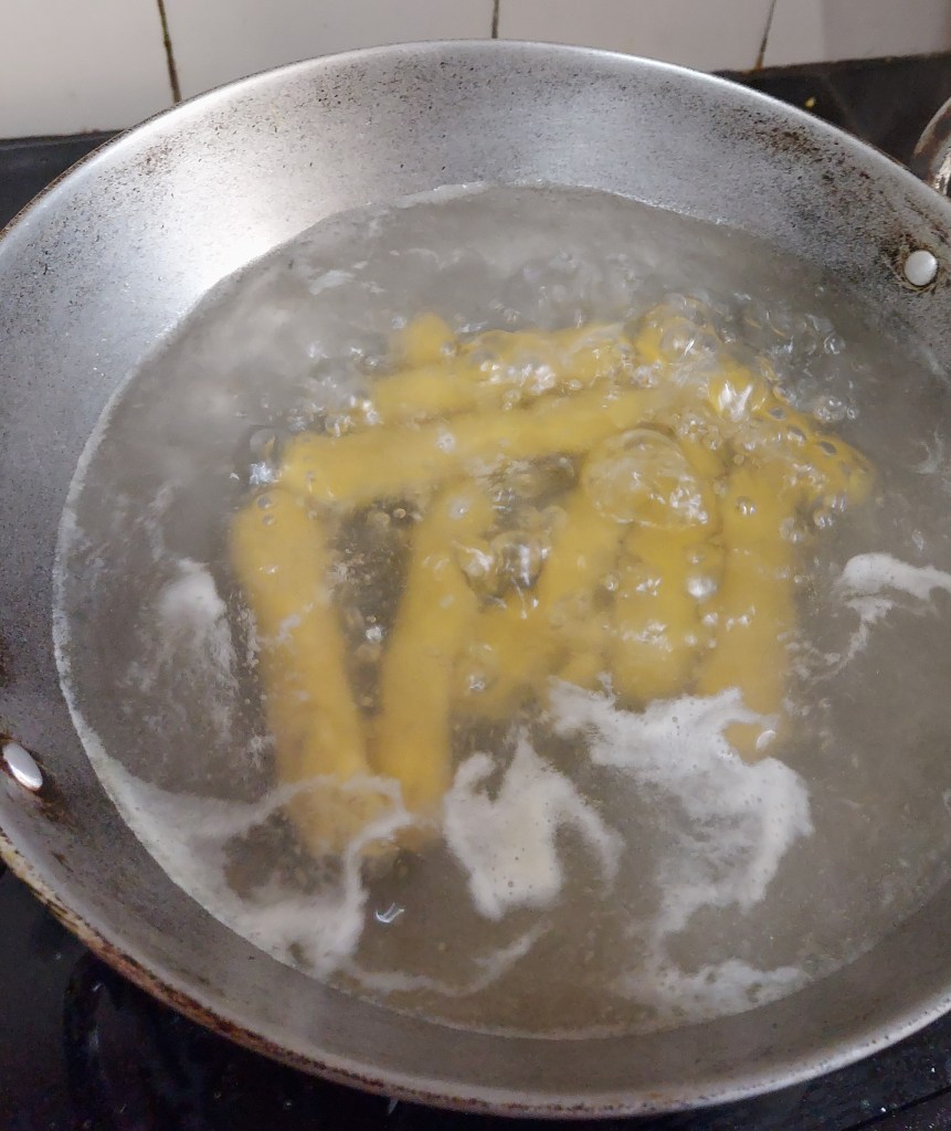 Add all ingredients listed under ghatte except water and mix with hand, then by slowly adding water make a sticky dough. Grease your palm and take handful of dough and between palm roll into thin cylinders. Boil water in a wok, once water is rolling boil, slowly dip these cylinders, after 5-7 minutes color will change, then slowly take them out. Once, little cool, cut them into individual discs. Take oil in a wok and shallow fry these disc batch wise.