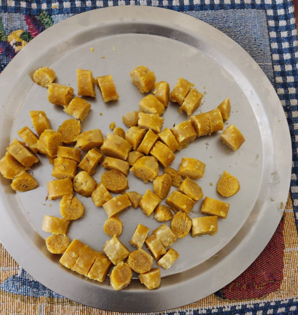 In Indian Summers, when green vegetables are scarce, gravy made out of besan are very popular, here I share another recipe. Ghatte refers to boiled, shallow fried besan dumplings.