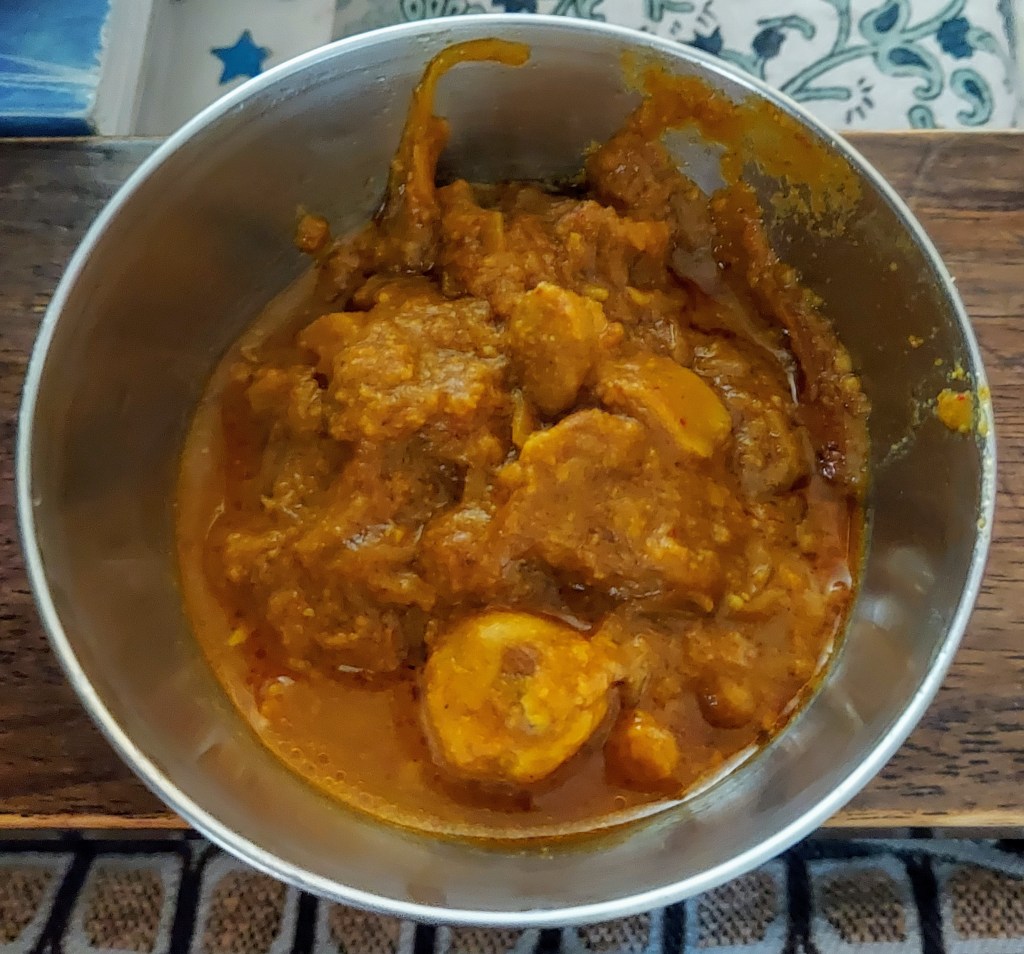 Add some more oil in the same wok. Add bay leaf, cardamom, cinnamon stick, cloves, let it splutter. Add onions, fry till brown, mix garlic paste, coriander, cumin, red chili, turmeric with 1 tablespoon of water and add. Fry till oil separates, then add sauteed ghattas, mix to ensure all ghattas are nicely coated with spices, then add water, let the gravy simmer for 7-10 minutes, adjust water quantity according to consistency you need. Ghatte ki sabji taste best with plain rice.