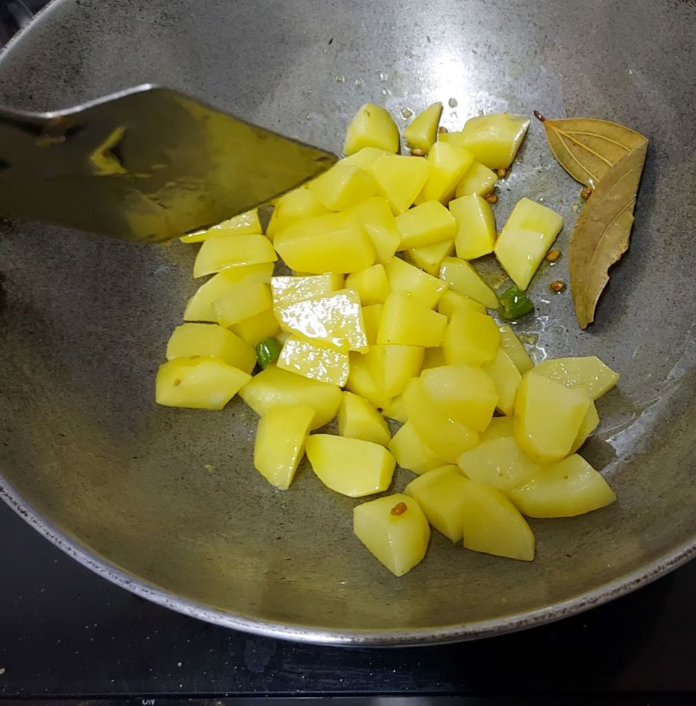 Take a wok, add oil, let it heat, add bay leaf, fenugreek seeds, green chili, once it splutter, add diced potatoes,