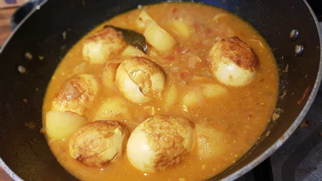 Once curry starts boiling, add all the eggs, simmer / boil for few minutes, cover and switch off the flame.