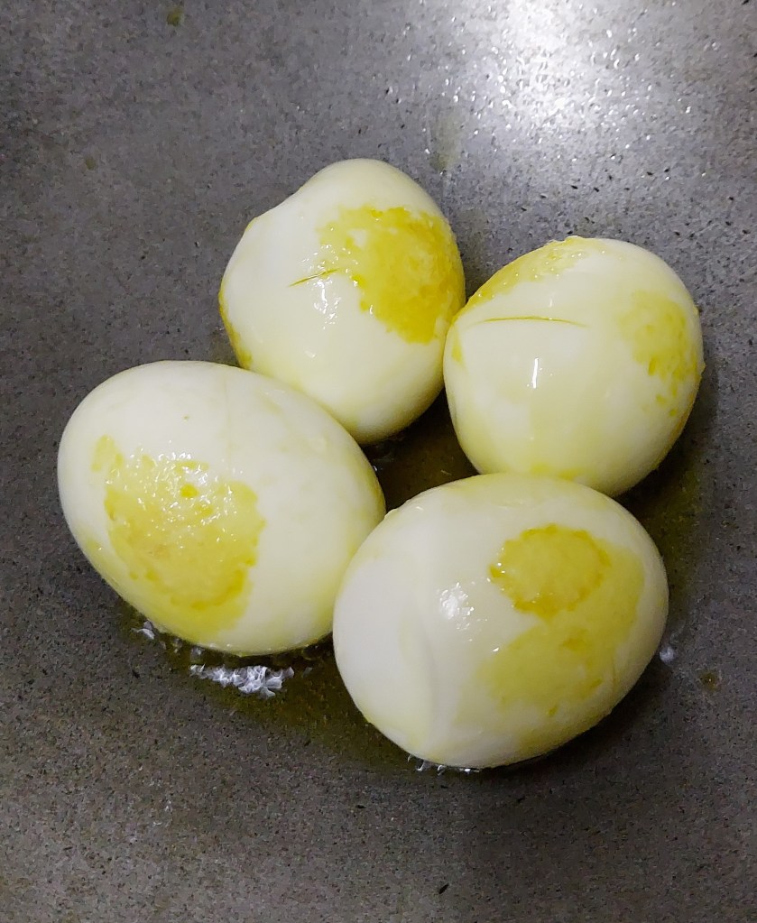 Put some oil in a wok. Once, sufficiently hot, tip 4-5 eggs, and saute till brown patches seen on the egg. Repeat with remaining eggs.