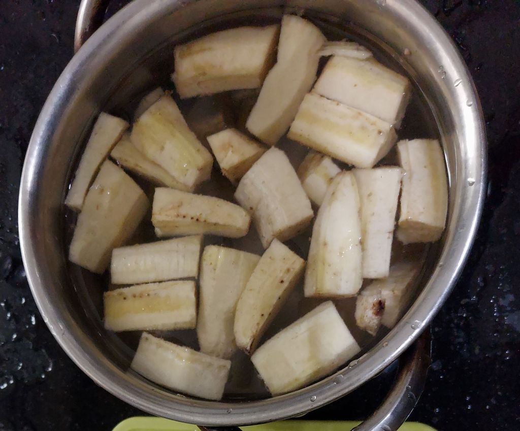 Grease your palm, slice each banana into 2-3 large pieces with peel. Using a knife slit across the peel of each piece and slowly remove the peel. Put all peeled pieces in a bowl of water with some salt in it. Once, peeling is complete, cut each piece into 4 long pieces.