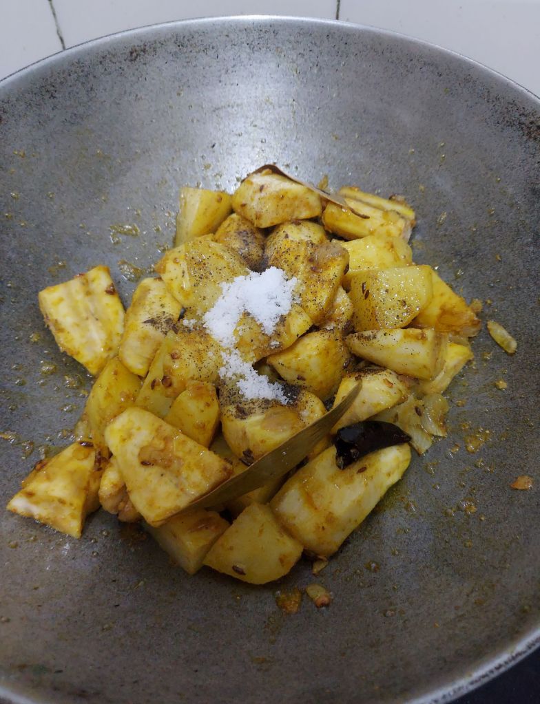 Put a wok on cookstove. Add oil. Once, oil is hot, add bay leaves, cumin seeds and red chili. Once they splutter add ginger, stir fry for 30 seconds. Add banana pieces and all the dry spices except salt (Note: if you add salt now, pieces will turn soggy) . Sautee for 5-6 minutes, till oil separation and little browning of banana pieces starts, add salt and 2 cups of water, cover and let it simmer till banana are soft & cooked. Note: Usually curry is kept little watery as this is eaten with white rice.